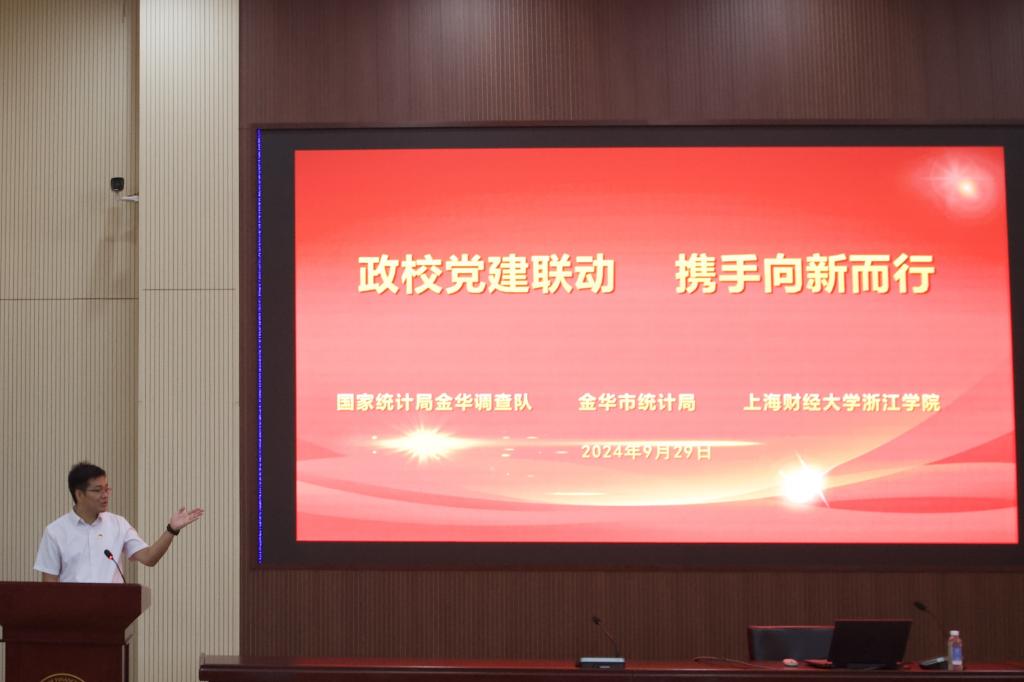 9月29日,学院统计系联合国家统计局金华调查队、金华市统计局,在学院120报告厅开展了“政校党建联动 携手向新而行”主题党日活动。此次活动不仅是一次党建联建的重要实践,也是对前期政校党建联建成果的精彩展示和深化拓展,更是学院积极推进“一融双高”建设与统计系践行“双学双融”发展理念的生动实践。活动中,还举行了新生“开学第一课”系列活动启动仪式。市调查队党组成员、副队长张国民、楼涛及纪检组长徐玉飞,市统计局党组成员、社会经济调查队队长赵奇峰,上海财经大学教务处副处长吴纯杰,以及学院党委副书记何志强、学院党委委员、组织部部长张正亮等出席活动。此外,来自市调查队和市统计局的党员、干部代表,以及乐玩全体新生和师生党员等共计200余人也参与了此次主题党日活动。