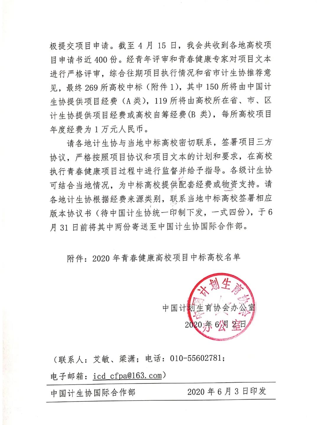 为深入贯彻党的十九大精神,有效落实《“健康中国2030”规划纲要》和《中长期青年发展规划(2016-2025年)》有关要求,按照《中国计划生育协会改革方案》和《青春健康工作第三个五年规划(2020-2024年)》部署,中国计生协于2020年初面向全国开展第八期青春健康高校项目招标。项目旨在培养有责任、有担当、有作为的青年人,树立正确的人生观、价值观和婚恋观,促进大学生健康发展。同时结合本年度新冠疫情防治工作,普及健康知识,提高公共卫生健康意识和健康行为习惯的养成,巩固和发展高校青春健康工作阵地,增强计生协“青春健康”工作品牌的影响。