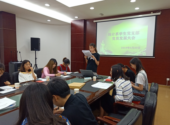 2019年5月20日18:30,统计系学生党支部在28幢226会议室召开2019年上半年党员发展大会。参加会议的有统计系党总支副书记吴京京老师、统计系学生党支部书记韩丹华老师、全体学生党员和虞淑文等十二名发展对象。