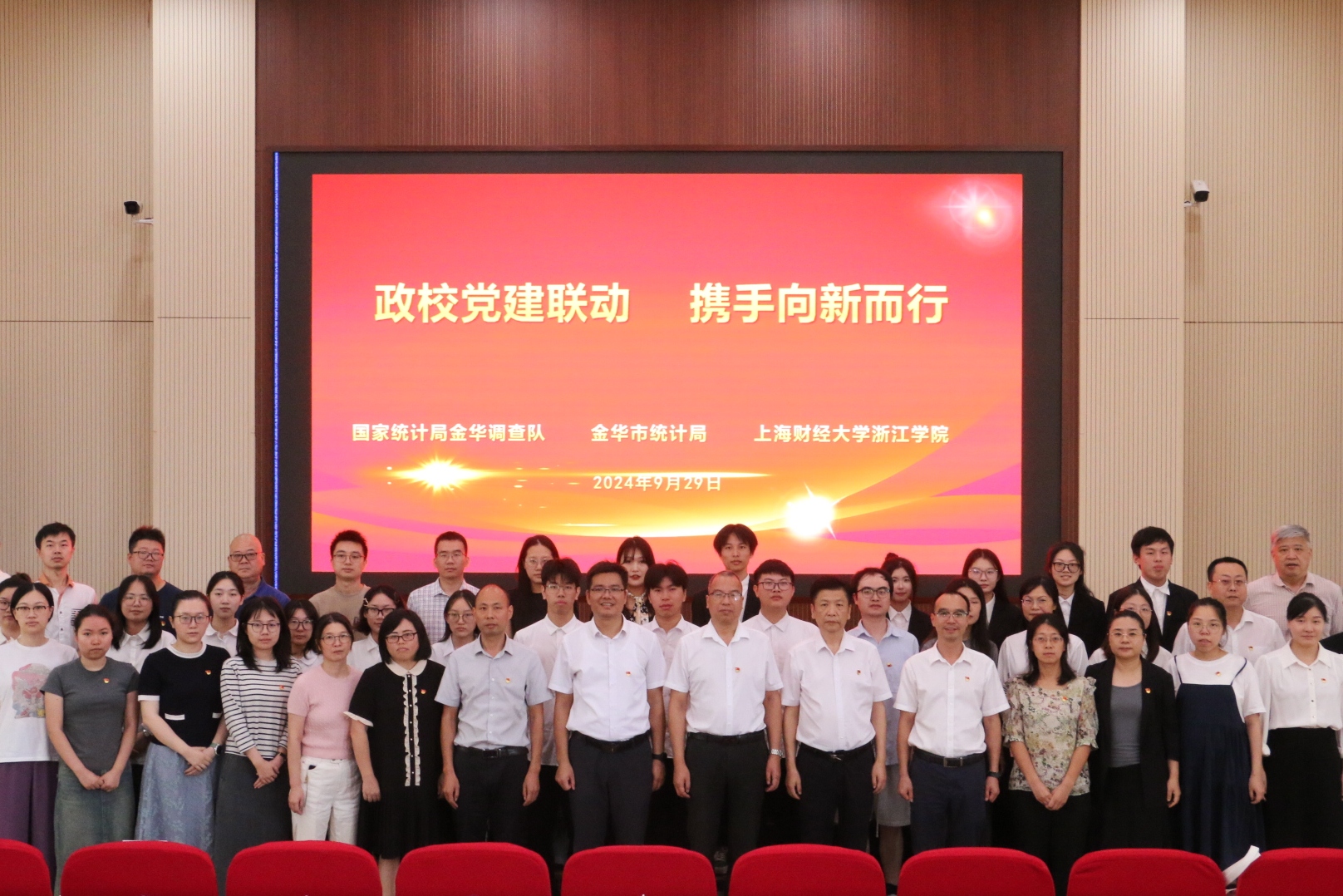 9月29日,学院统计系联合国家统计局金华调查队、金华市统计局,在学院120报告厅开展了“政校党建联动 携手向新而行”主题党日活动。此次活动不仅是一次党建联建的重要实践,也是对前期政校党建联建成果的精彩展示和深化拓展,更是学院积极推进“一融双高”建设与统计系践行“双学双融”发展理念的生动实践。活动中,还举行了新生“开学第一课”系列活动启动仪式。市调查队党组成员、副队长张国民、楼涛及纪检组长徐玉飞,市统计局党组成员、社会经济调查队队长赵奇峰,上海财经大学教务处副处长吴纯杰,以及学院党委副书记何志强、学院党委委员、组织部部长张正亮等出席活动。此外,来自市调查队和市统计局的党员、干部代表,以及乐玩全体新生和师生党员等共计200余人也参与了此次主题党日活动。